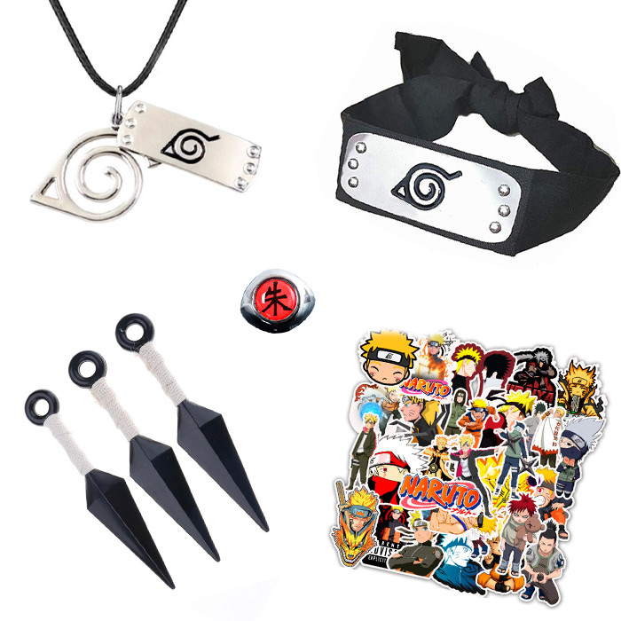 Набор Наруто повязка коноха, кулон коноха, кунай белый, кольцо Итачи, стикеры – Naruto без которого не обходится ни одна тематическая вечеринка. Здесь представлены все самые важные для шиноби аксессуары, а на некоторых из них изображена символика деревни Скрытого Листа.